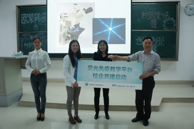 重慶醫(yī)科大學(xué)檢驗(yàn)醫(yī)學(xué)院黨總支書記翁亞光教授、校實(shí)驗(yàn)教學(xué)管理中心李革主任、歐蒙學(xué)院負(fù)責(zé)人盧潔女士就熒光免疫教學(xué)共建達(dá)成合作。