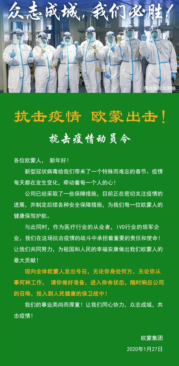 2020年的春節(jié),因為一場新型冠狀病毒肺炎的傳播,讓很多人的春節(jié)假期因此改變。自疫情發(fā)生以來,歐蒙一直都保持著高度的關(guān)注,面對疫情快速響應(yīng),在第一時間成立了三個工作組,部署相 關(guān)戰(zhàn)略實施:應(yīng)急領(lǐng)導(dǎo)小組、銷服協(xié)調(diào)小組、緊急行動小組。應(yīng)急領(lǐng)導(dǎo)工作小組第一時間將公司最新動態(tài)與決策以最快速度傳遞到每一位歐蒙員工中,并采取各種措施保障員工的安全;銷服協(xié)調(diào)小組緊急召回部分員工,保證我們對醫(yī)療機(jī)構(gòu)的支持與服務(wù);緊急行動小組通過對新冠病毒檢測服務(wù)與產(chǎn)品的開發(fā),力爭為抗擊疫情做出更多貢獻(xiàn)。大家眾志成城、共克時艱!