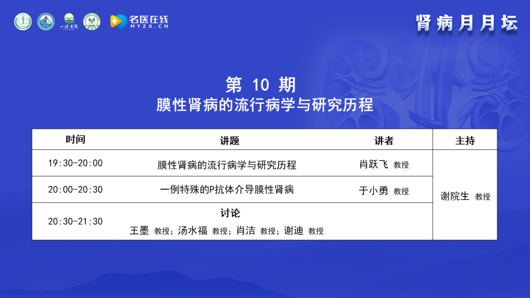眾所周知,腎臟病患病率很高,特別是膜性腎病,在很多單位的腎活檢比例中占據首位。膜性腎病的無創診斷和治療手段日新月異,而且膜性腎病的異質性很大,很多膜性腎病的病理表現大同小異,但是致病原因卻不一致,診療手段應對應病因。基于此背景,“腎病月月壇”自2022年5月17日開始舉辦,在每個月的第三周的周二晚上,每月一期,每期一個主題,已經舉辦了9期,包括”激素和免疫抑制劑在膜性腎病的合理應用”、“利妥昔單抗在膜性腎病的合理應用”、“原發性和繼發性膜性腎病的鑒別”、“中醫對膜性腎病的認識”、“膜性腎病的抗原分類及發病機制”、“膜性腎病的臨床表現、無創診斷和病理診斷”、“膜性腎病的自發緩解和非免疫抑制治療”、“非典型膜性腎病的病理表現及鑒別診斷思路”、“膜性腎病與腫瘤”。本期是“腎病月月壇”的第10期,主題是“膜性腎病的流行病學與研究歷程”,通過對膜性腎病不同的專題進行深入探討,希望大家對膜性腎病有更深的認識。膜性腎病近幾年在診斷方面有跨時代進步,特別是非創傷性的檢測磷脂酶A2受體,對疾病的診斷、預后判斷、治療選擇上都非常有幫助。還有膜性腎病各種新的治療手段,包括單克隆抗體在膜性腎病中的應用進展也日新月異。針對這些問題,本期特舉辦膜性腎病的流行病學與研究歷程的專題學術活動,邀請的講者和點評、討論嘉賓都是業內非常著名的臨床專家、研究生導師、腎內科主任,具有豐富的臨床、教學和科研經驗,相信他們的分享一定會對大家的臨床診療有所幫助。