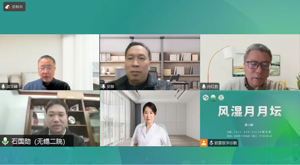 2024年11月26日(周二),由江蘇省研究型醫院學會和一味書院主辦的《風濕月月壇(第14期)—2024 ACR-EULAR(美國風濕病學會年會、歐洲風濕病聯盟年會)新進展》于線上成功舉辦。本次論壇由江蘇省人民醫院談文峰教授擔任大會主席,無錫市第二人民醫院石國勛教授、山西醫科大學第一醫院溫鴻雁教授作為講課嘉賓,常州市第一人民醫院吳敏教授、山東省立醫院孫紅勝教授作為本次會議的討論嘉賓。